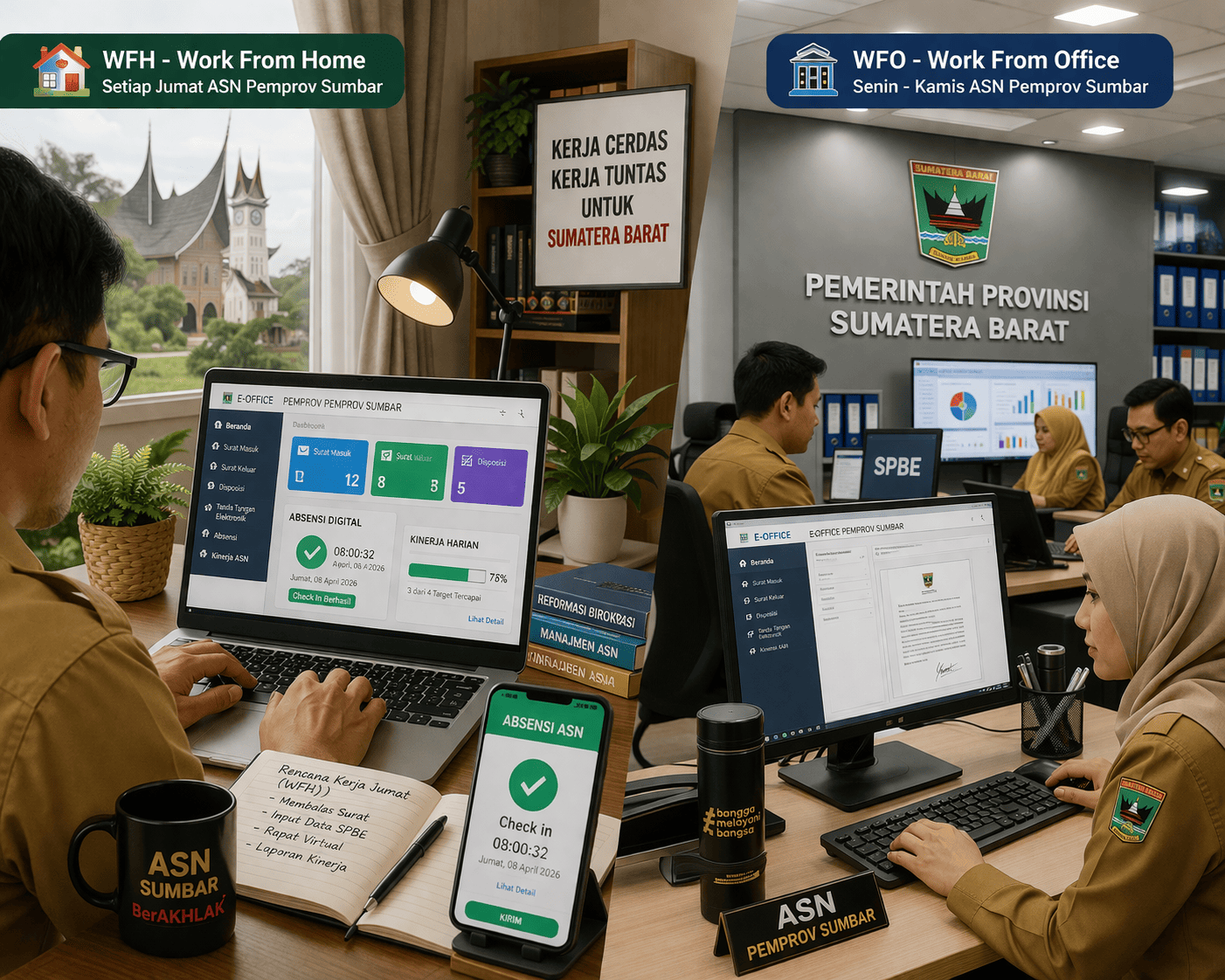 Pengawasan juga diperkuat melalui presensi digital serta pelaporan berbasis hasil. Dengan sistem ini, Pemprov Sumbar memastikan kontrol kinerja tetap berjalan meski ASN bekerja dari rumah.