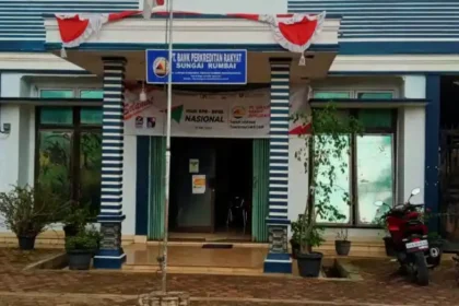 Kantor PT BPR Sungai Rumbai di Jalan Lintas Sumatera, Dharmasraya, Sumatera Barat. Pencabutan izin BPR Sungai Rumbai resmi diumumkan di Padang pada 7 April 2026 oleh Otoritas Jasa Keuangan (OJK). Kepu...