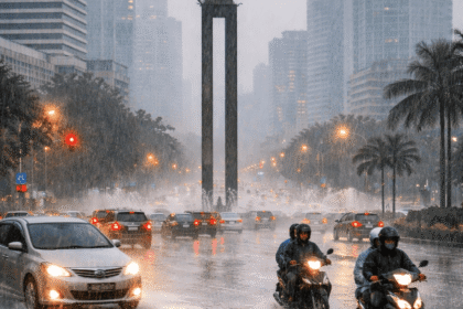 Ilustrasi hujan lebat mengguyur jakarta saat cuaca ekstrem melanda sejumlah wilayah. SWARNASUMBAR.COM–BMKG mencatat intensitas hujan tinggi di berbagai wilayah Indonesia menjelang periode mudik ...