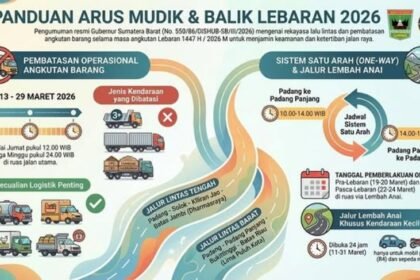 SWARNASUMBAR.COM–Pemerintah Provinsi Sumatera Barat menetapkan rekayasa lalu lintas dan pembatasan operasional angkutan barang selama masa angkutan Lebaran 1447 H/2026 M guna menjaga kelancaran ...