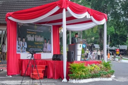 Gubernur Sumbar Mahyeldi Ansharullah menyampaikan sambutan saat Salat Idul Fitri 1447 H di Halaman Kantor Gubernur Sumbar, Padang. SWARNASUMBAR.COM — Gubernur Sumatera Barat, Mahyeldi Ansharullah, men...