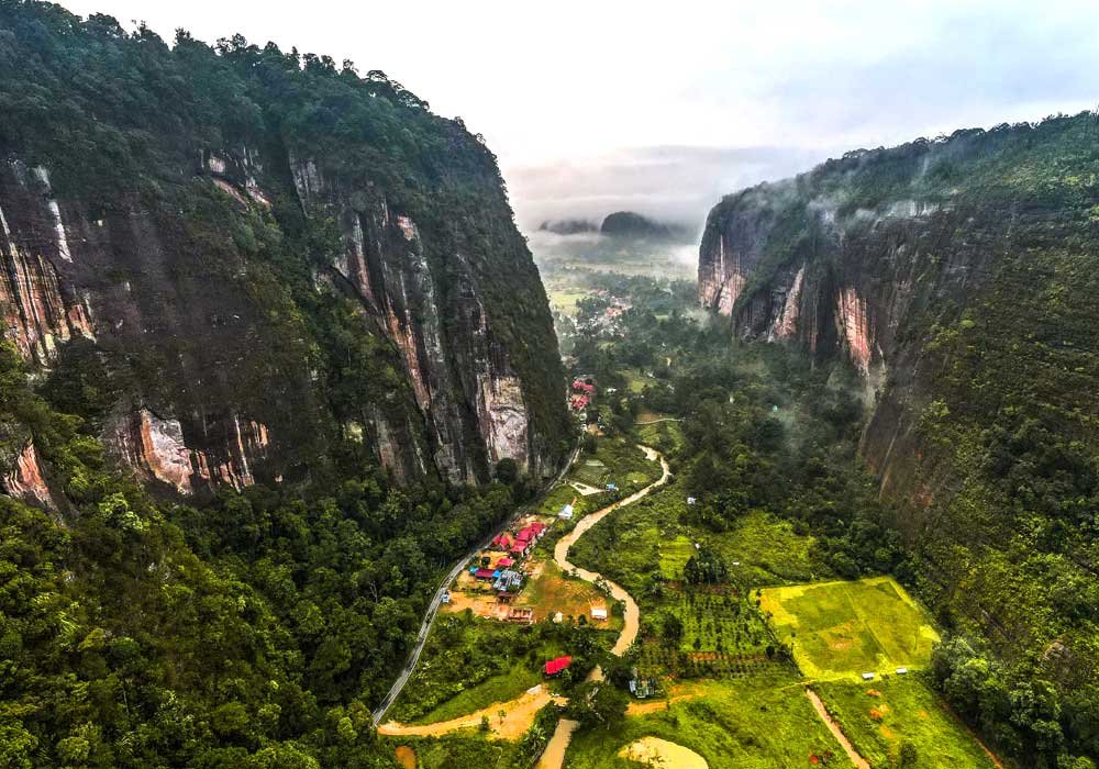 Tebing batuan sedimen menjulang di Lembah Harau, Sumatera Barat, yang terbentuk dari endapan dasar laut purba.