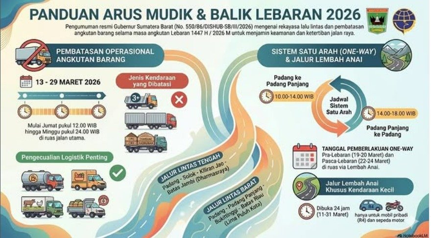 SWARNASUMBAR.COM–Pemerintah Provinsi Sumatera Barat menetapkan rekayasa lalu lintas dan pembatasan operasional angkutan barang selama masa angkutan Lebaran 1447 H/2026 M guna menjaga kelancaran perjalanan masyarakat. Kebijakan ini tertuang dalam pengumuman resmi Gubernur Sumatera Barat Nomor 550/86/DISHUB-SB/III/2026 yang mulai berlaku pada pertengahan Maret 2026.