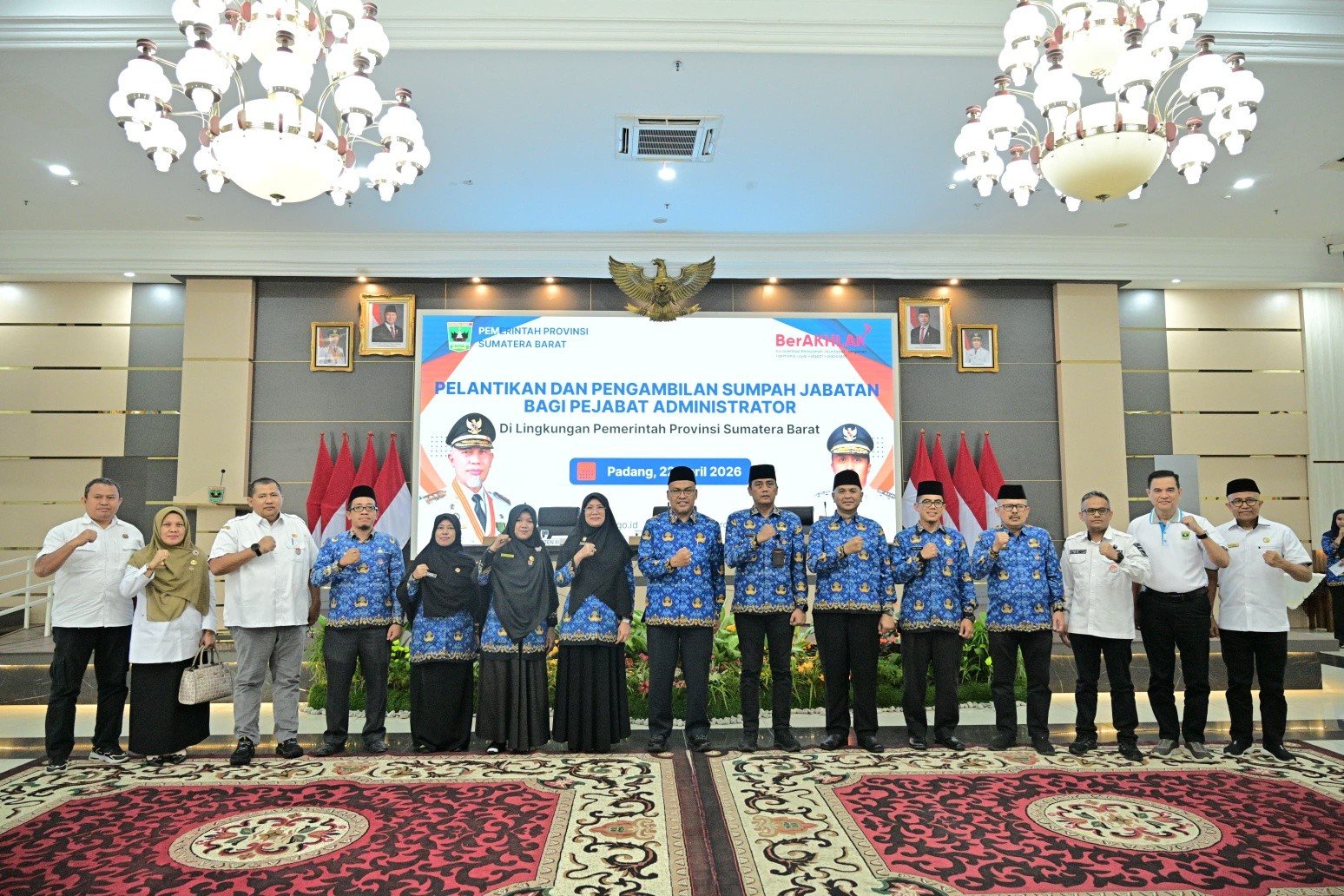 PADANG — Pelantikan pejabat administrator Sumbar berlangsung di Auditorium Gubernuran, Rabu (22/4/2026), saat Sekretaris Daerah Provinsi Sumatera Barat Arry Yuswandi melantik delapan pejabat di lingkungan Pemerintah Provinsi Sumbar. Prosesi ini mengacu pada Surat Keputusan Gubernur Sumatera Barat Nomor 821/1810/BKD-2026 sebagai langkah penguatan kelembagaan dan peningkatan kinerja organisasi perangkat daerah.