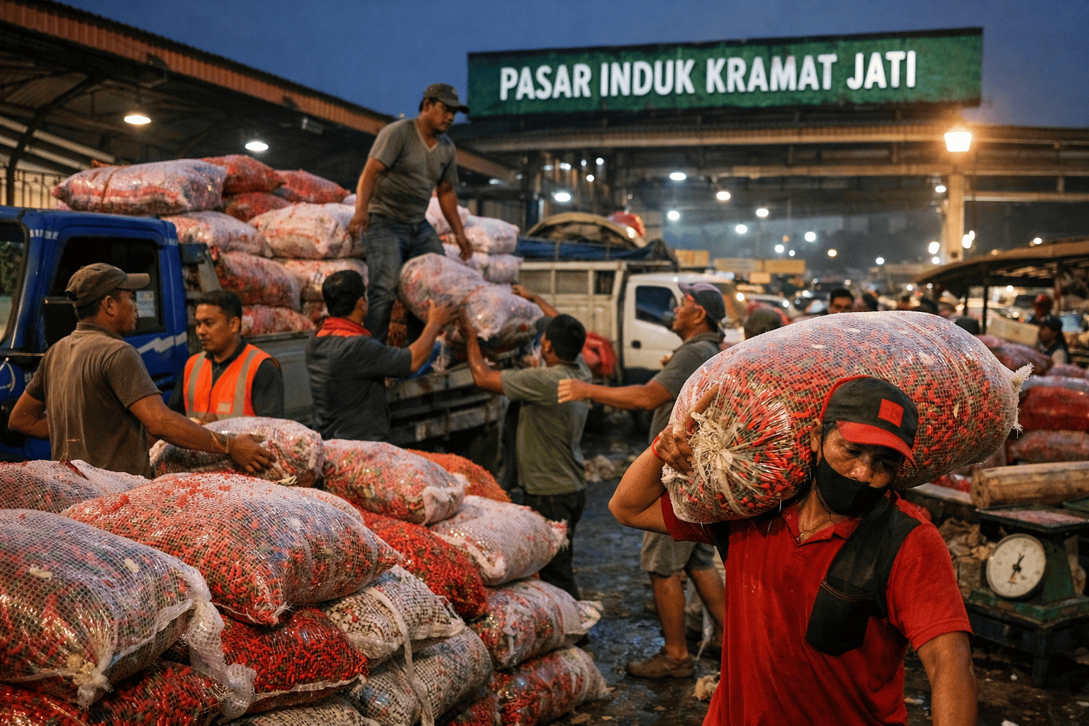 Ilustrasi Aktivitas bongkar muat cabai di Pasar Induk Kramat Jati saat pengguyuran pasokan untuk menjaga stabilitas harga jelang Ramadan–Idulfitri 1447 H.